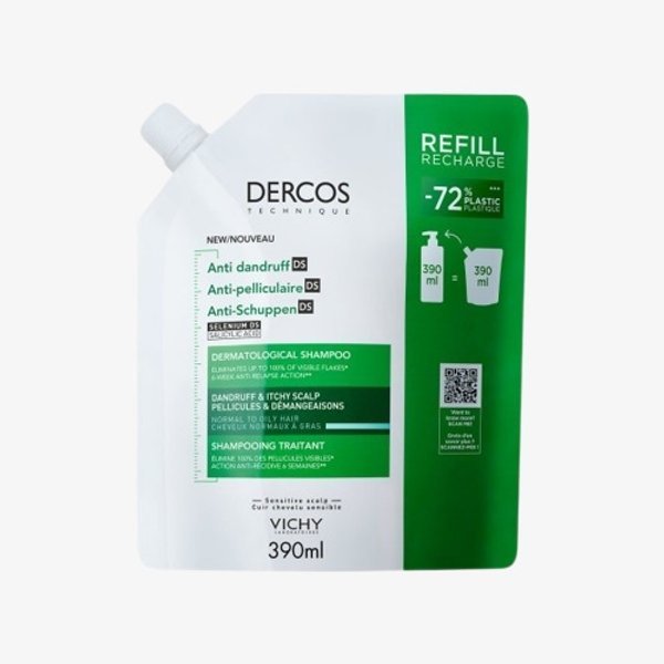 Anti-Pelliculaire Shampooing Traitant Pellicules et Démangeaisons Cheveux Normaux à Gras, Eco-recharge 390ml