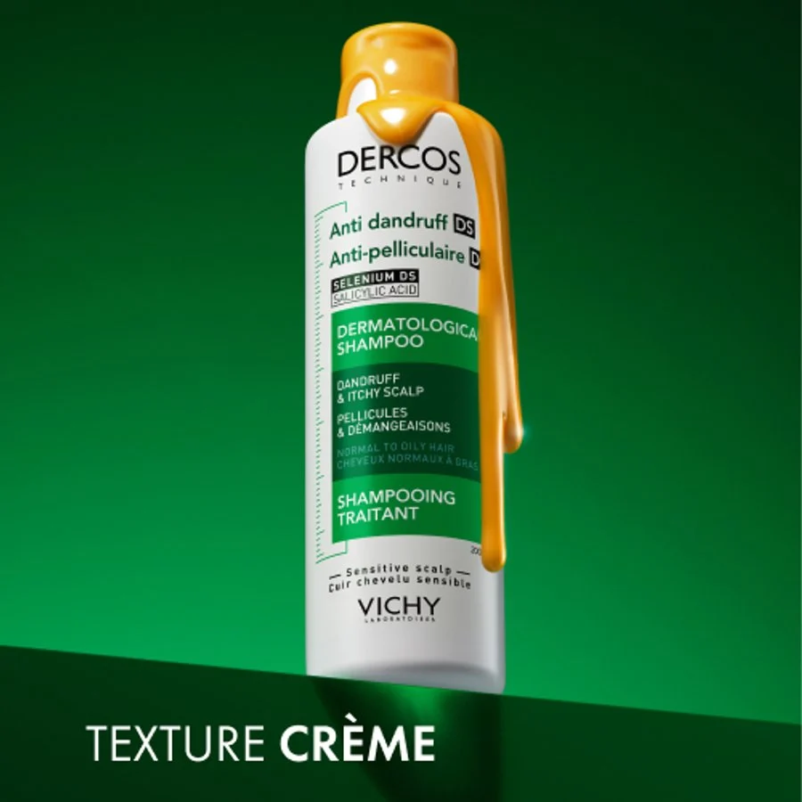 - Le shampooing anti-pelliculaire DS DERCOS pour cheveux normaux à gras combine la Technologie Microbiome au Sélénium DS à l’Acide Salicylique pour corriger les pellicules et éviter leur récidive. Dès la première application, le cuir chevelu est plus sain, les démangeaisons apaisées et les pellicules diminuées.