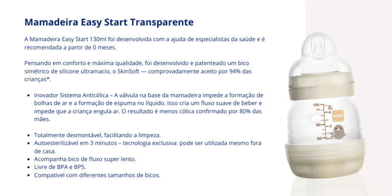 Mamadeira Easy Start  é uma solução inovadora e cuidadosamente desenvolvida para a alimentação dos bebês desde os primeiros dias de vida. Projetada para minimizar a incidência de cólicas e desconfortos, esta mamadeira se destaca por sua tecnologia exclusiva de base ventilada. Este sistema permite um fluxo de líquido contínuo e uniforme, evitando que o bebê engula ar durante a sucção, o que reduz significativamente a formação de gases e o risco de regurgitação. O seu bico de silicone SkinSoft, com uma textura macia e sedosa e formato achatado, foi criado para simular a sensação do seio materno, garantindo uma altíssima taxa de aceitação pelos pequenos. Além de ser um dos acessórios mais importantes para mamães e bebês nesta fase, ela oferece praticidade incomparável com sua função autoesterilizável, que permite a higienização completa no micro-ondas em apenas 3 minutos. Fabricada com materiais seguros e totalmente livre de BPA e BPS, a Mamadeira Easy Start é a escolha ideal para uma transição suave e uma alimentação tranquila e segura.